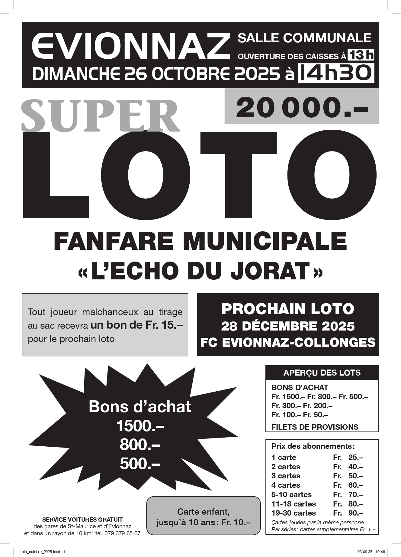 Transport gratuit par voitures des gares de St-Maurice, et Evionnaz et dans un rayon de 10 km. Tél. 079 379 65 67