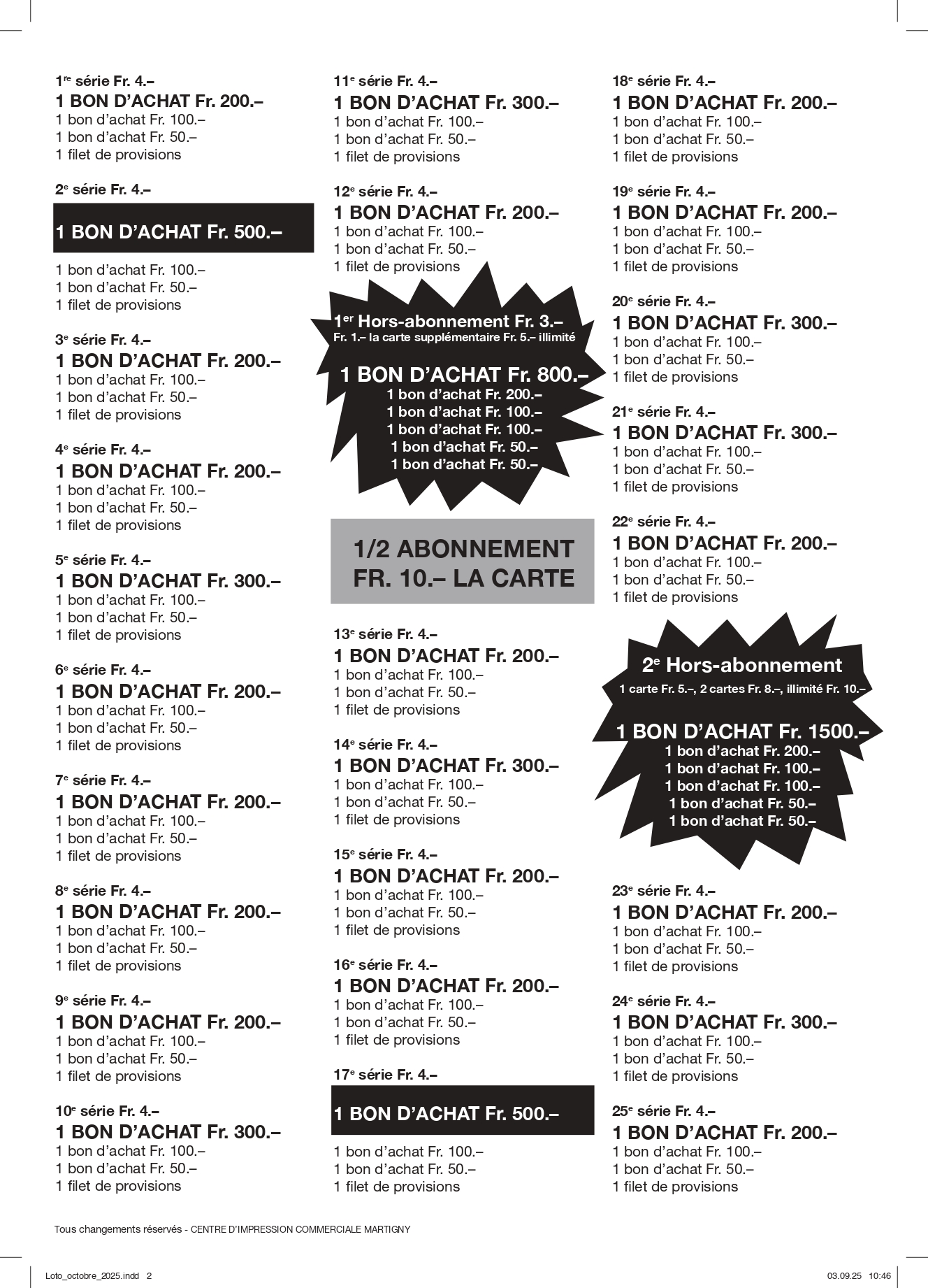 Bons d'achat CHF 1500.- / CHF 800.- / CHF 500.- / CHF 300.- / CHF 200.- / CHF 100.- / CHF 50.-