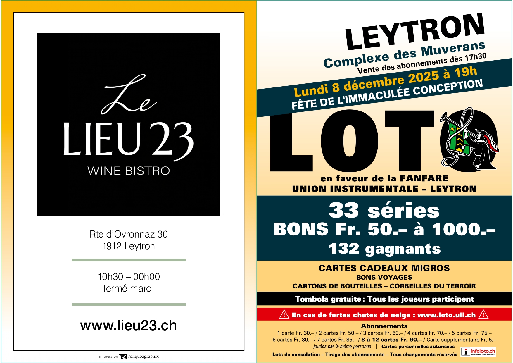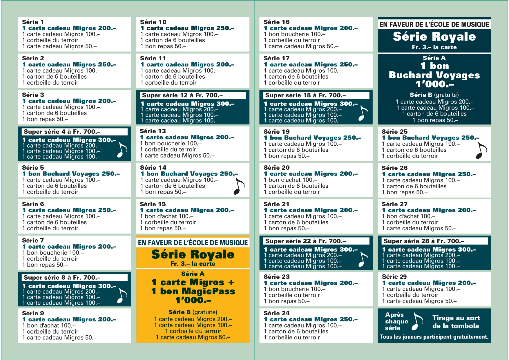 1 carte Fr. 30.– / 2 cartes Fr. 50.– / 3 cartes Fr. 60.– / 4 cartes Fr. 70.– / 5 cartes Fr. 75.– / 6 cartes Fr. 80.– /