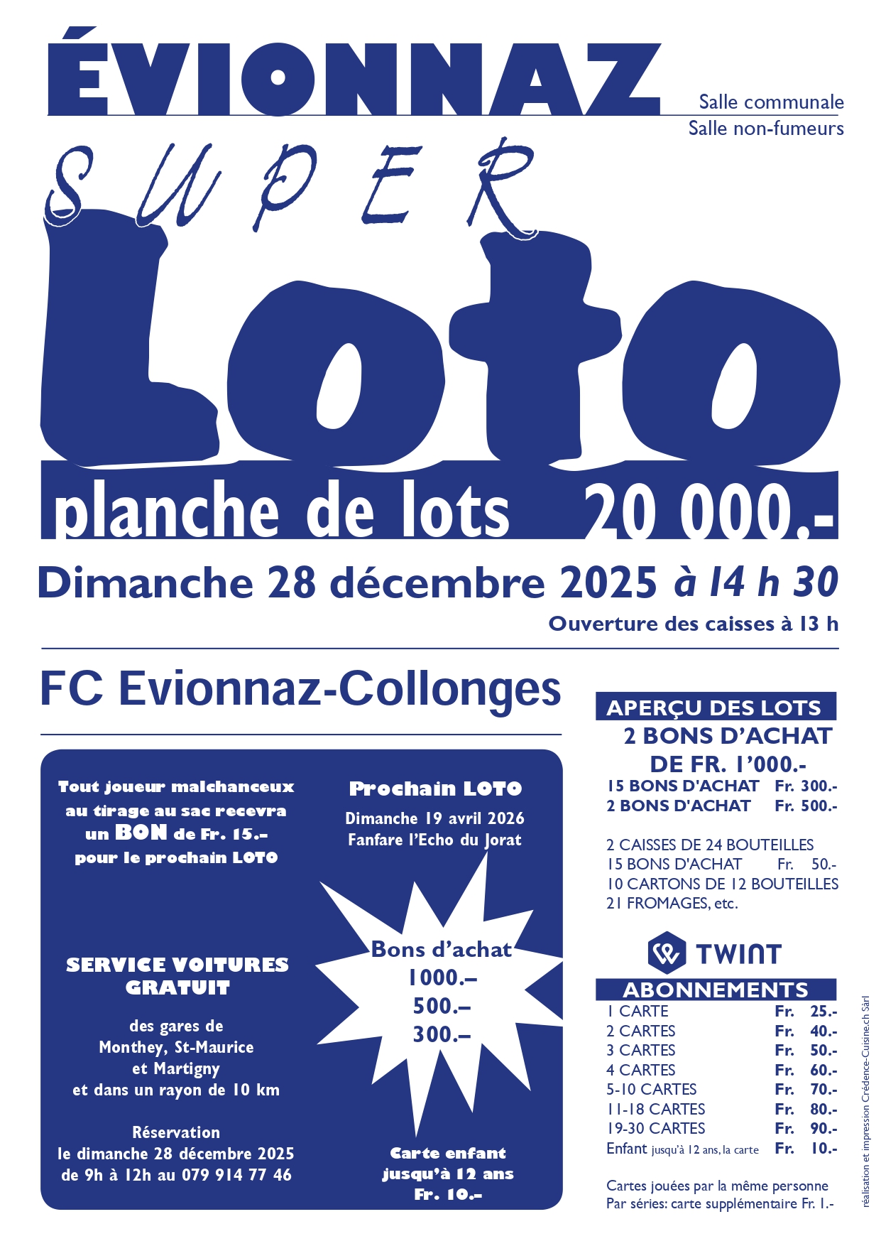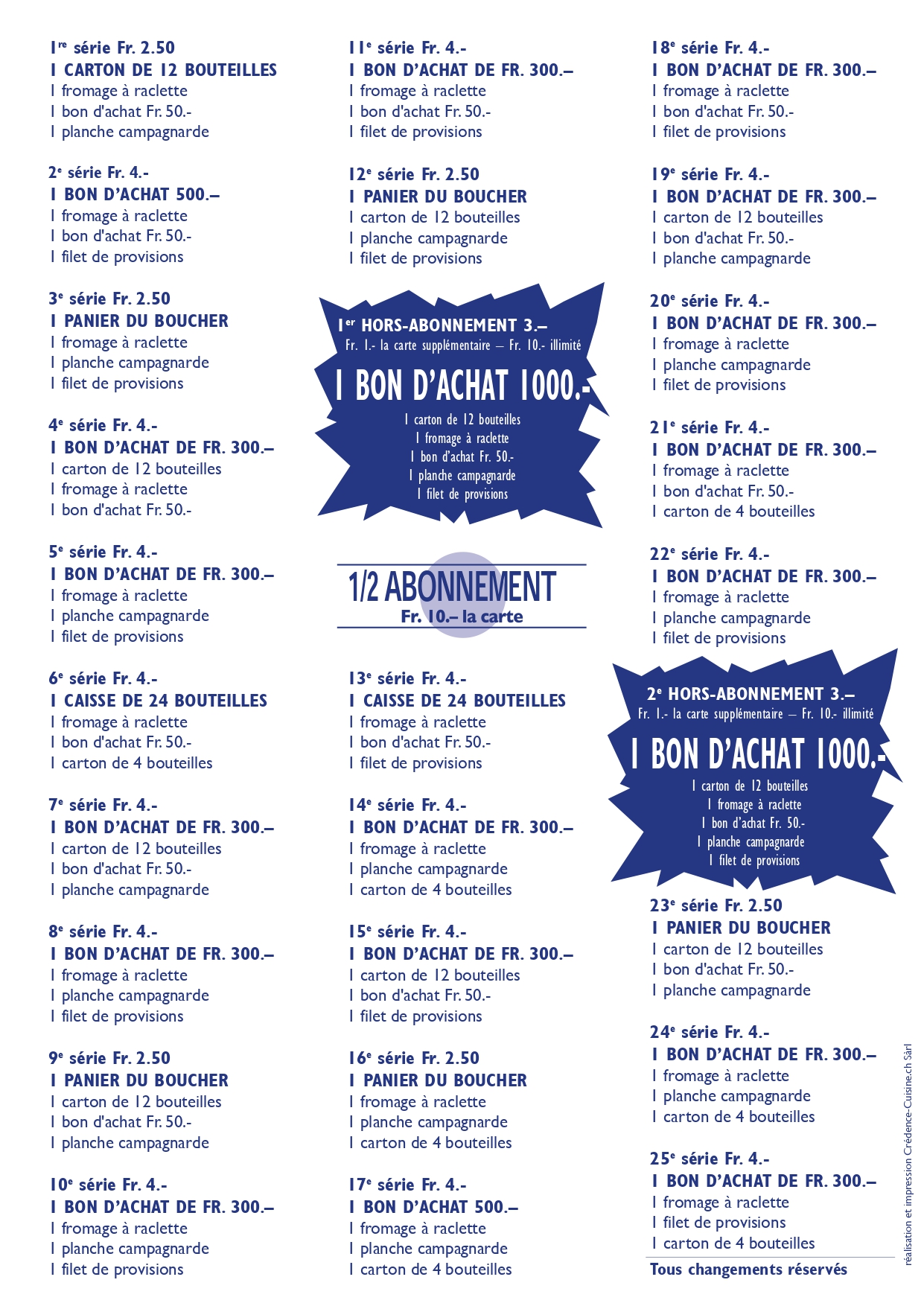 2 bons d'achat de 1'000.-, 15 bons d'achat de 300.-, 2 bons d'achat de 500.-, bouteilles, fromages, paniers du boucher, ...