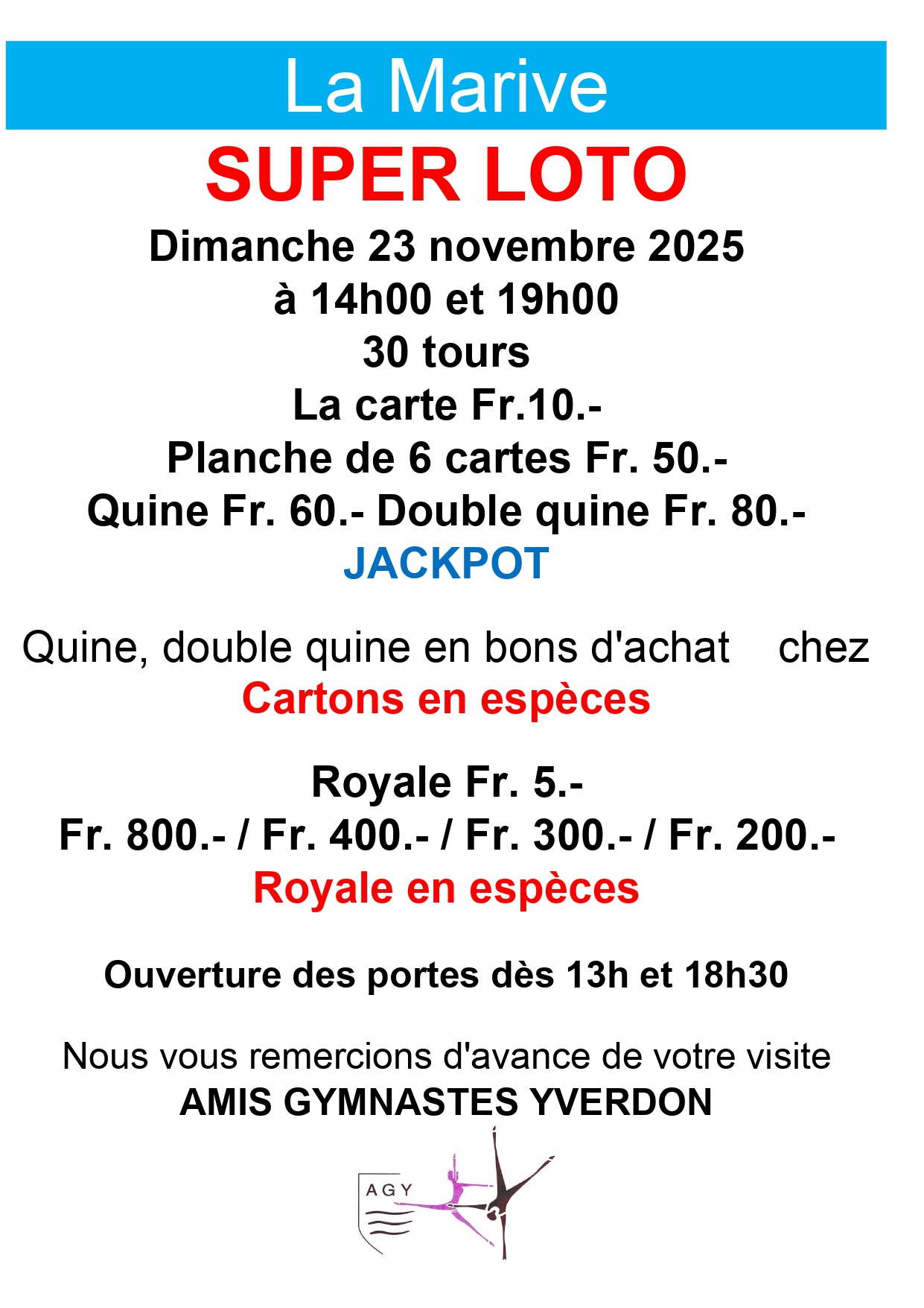 Quine CHF 60.- / Double-quine CHF 80.- / Carton CHF 120.- (Quines et double-quines en bons d'achat commerçants locaux, cartons en cash)